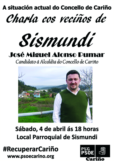 Estamos xa rematando a presente rolda de reunións públicas coa veciñanza das parroquias do noso Concello, que nos está servindo para coñecer mellor as súas inquedanzas e necesidades, pero tamén para avanzar algunhas ideas do noso proxecto para os vindeiros anos. Tras pasar por Landoi, A Pedra e Feás, este sábado 4 de abril, o noso candidato á Alcaldía José Miguel Alonso Pumar e outros membros da súa candidatura reuniranse coa veciñanza da parroquia de Sismundi. A cita será ás seis da tarde no Local Parroquial de Sismundi.
