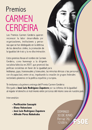 Na súa primeira edición o Premio Carmen Cerdeira outórgaselle a José Luis Rodríguez Zapatero pola súa defensa da igualdade ó regular o dereito ó matrimonio entre as persoas do mesmo sexo no noso país. A entrega do premio terá lugar o domingo 30 de xuño ás 12 horas na sede socialista de Ferraz, acto no que intervirán Purificación Causapié, Elena Valenciano, José Luis Rodríguez Zapatero e Alfredo Pérez Rubalcaba.